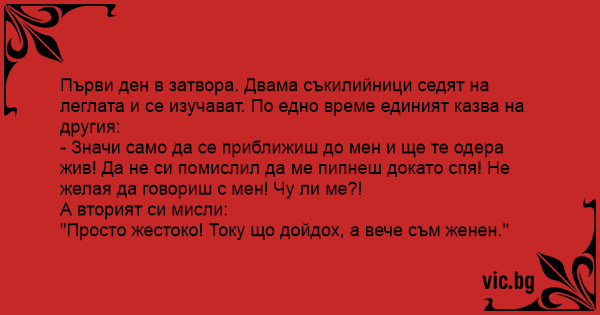 Първи ден в затвора. Двама съкилийници седят на леглата и се изучават. По едно време единият казва на другия: