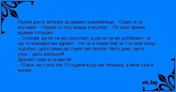 Първи ден в затвора за двама съкилийници... Седят и се изучават... Гледат се под вежди и мълчат... По едно време единия отпушил: