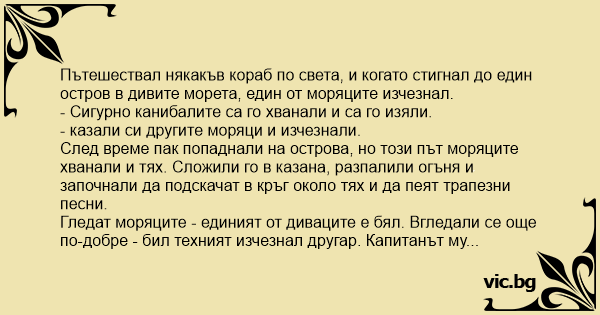 Пътешествал някакъв кораб по света, и когато стигнал до един остров в дивите морета, един от моряците изчезнал.