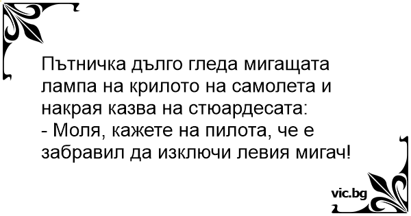 Пътничка дълго гледа мигащата лампа на крилото на самолета и накрая казва на стюардесата: