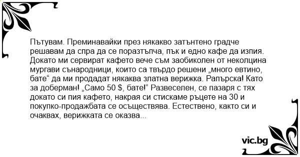 Докато ми сервират кафето вече съм заобиколен от неколцина мургави сънародници, които са твърдо решени „много евтино, бате“ да ми продадат някаква златна верижка. Рапърска! Като за доберман! „Само 50 $, бате!“ Развеселен, се пазаря с тях докато си пия кафето, накрая си стискаме ръцете на 30 и покупко-продажбата се осъществява. Естествено, както си и очаквах, верижката се оказва менте. Както впрочем и 50-те $ с които я платих… Но двайсетте които ми върнаха си бяха съвсем истински!!!