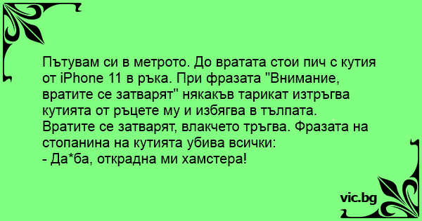 Пътувам си в метрото. До вратата стои пич с кутия от iPhone 11 в ръка. При фразата "Внимание, вратите се затварят" някакъв тарикат изтръгва кутията от ръцете му и избягва в тълпата.
