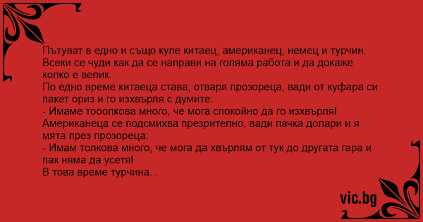 Немец, китаец, турчин и американец пътуват във влак.