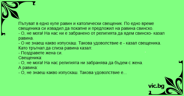 Пътуват в едно купе равин и католически свещеник. По едно време свещеника си извадил да похапне и предложил на равина свинско.