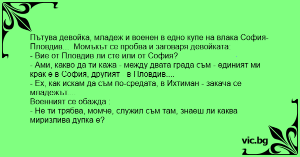 Пътува девойка, младеж и военен в едно купе на влака София-Пловдив... Момъкът се пробва и заговаря девойката: