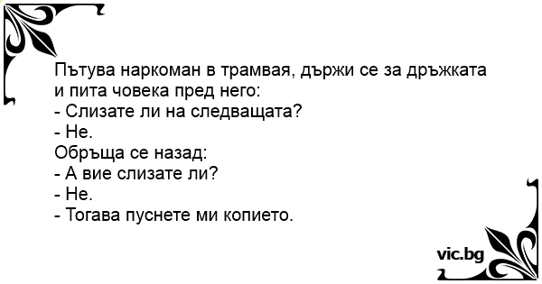 Пътува наркоман в трамвая, държи се за дръжката и пита човека пред него: