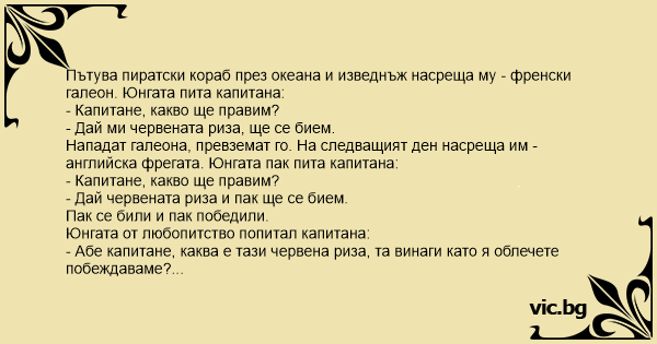 Плава си един пиратски кораб през океана и изведнъж отсреща се задава боен кораб. Юнгата тича при капитана: - Капитане, какво ще правим? - Донеси ми червената риза, ще се води битка. Облякъл си...