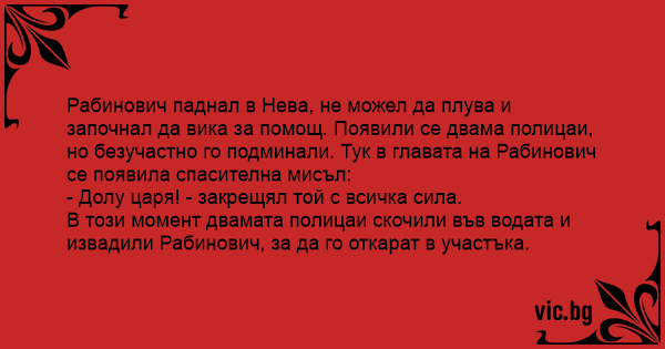 В този момент двамата полицаи скочили във водата и извадили Рабинович, за да го откарат в участъка.