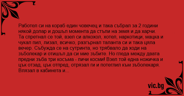 Та спретнал се той, взел си алкохол, хотел, наркотици, мацка и чуkaл пил, лизал, всичко, разгърнал таланта си и така цяла вечер. Събужда се на сутринта, но трябвало да ходи на зъболекар и отишъл да си мие зъбите. Но гледа между двата предни зъба три косъма - пичи косми! Взел той една ножичка и цък отзад, цък отпред, отрязал ги и потеглил към зъболекаря.