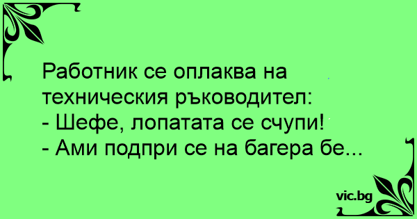 Градежниот работник му се јавува на шефот за да се оправда зошто работата не е завршена: – Шефе, ми се скрши лопатата! Шефот: – Ништо де, потпри се на багерот…