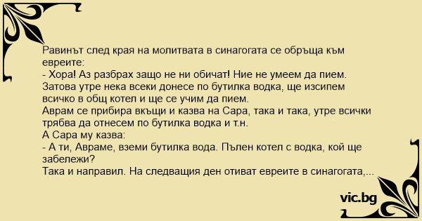 Така и направил. На следващия ден отиват евреите в синагогата, всеки излива бутилката в котела. Равинът взема черпака, разбърква, пълни черпака и пробва... С тъжен поглед оглежда хората и казва: