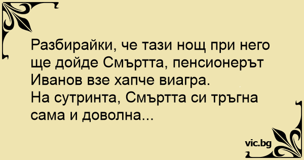 Разбирайки, че тази нощ при него ще дойде Смъртта, пенсионерът Иванов взе хапче bиaгpa.