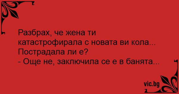 - Ало братучед, разбрав жена ти ја слупала колата. Да не е повредена? - Уште не е. Се заклучила во бањата…