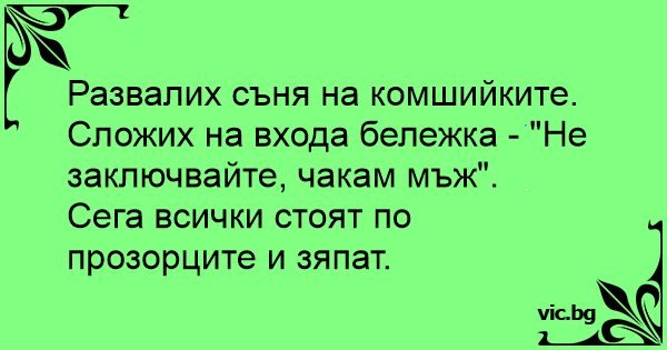 Развалих съня на комшийките. Сложих на входа бележка - "Не заключвайте, чакам мъж".