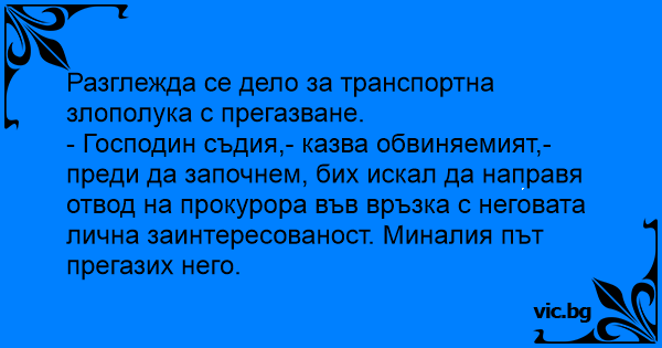 - Господин съдия,- казва обвиняемият,- преди да започнем, бих искал да направя отвод на прокурора във връзка с неговата лична заинтересованост. Миналия път прегазих него.