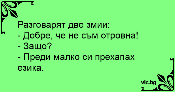 Δυο φίδια συζητάνε: - Ρε συ, ξέρεις αν είμαστε δηλητηριώδη; - Όχι δεν είμαστε, γιατί ρωτάς; - Δάγκωσα τη γλώσσα μου ρε γαμώτο!