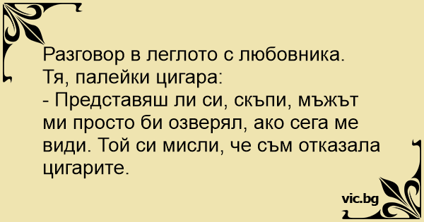 - Представяш ли си, скъпи, мъжът ми просто би озверял, ако сега ме види. Той си мисли, че съм отказала цигарите.