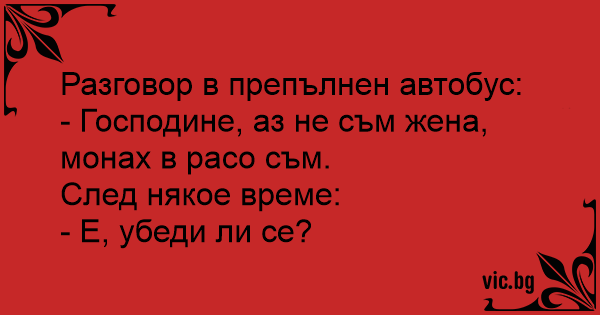 Разговор в переполненном автобусе: - Мужчина, я не женщина, я монах в рясе. Через некоторое время: - Ну что, убедились?