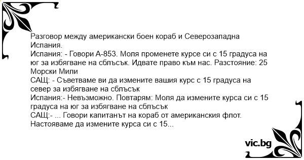 Испания:- Невъзможно. Повтарям: Моля да измените курса си с 15 градуса на юг за избягване на сблъсък