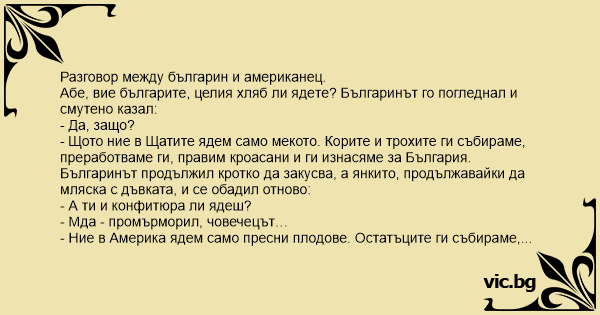 - Щото ние в Щатите ядем само мекото. Корите и трохите ги събираме, преработваме ги, правим кроасани и ги изнасяме за България. Българинът продължил кротко да закусва, а янкито, продължавайки да мляска с дъвката, и се обадил отново: