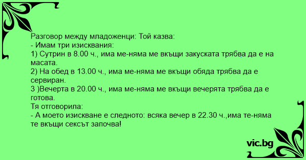- А моето изискване е следното: всяка вечер в 22.30 ч.,има те-няма те вкъщи cekcъt започва!