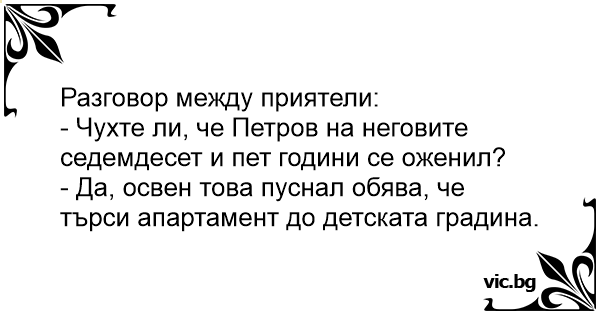 - Чухте ли, че Петров на неговите седемдесет и пет години се оженил?