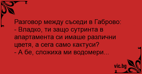 - Владко, ти защо сутринта в апартамента си имаше различни цветя, а сега само кактуси?
