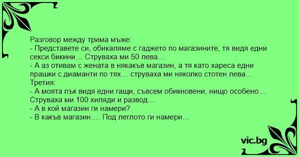 - Представете си, обикаляме с гаджето по магазините, тя видя едни cekcи бикини… Струваха ми 50 лева…