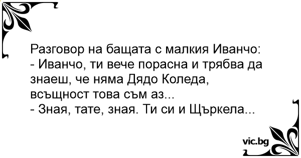 - Иванчо, ти вече порасна и трябва да знаеш, че няма Дядо Коледа, всъщност това съм аз...