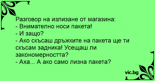 - Ако скъсаш дръжките на пакета ще ти скъсам задника! Усещаш ли закономерността?