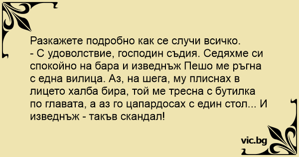 - С удоволствие, господин съдия. Седяхме си спокойно на бара и изведнъж Пешо ме ръгна с една вилица. Аз, на шега, му плиснах в лицето халба бира, той ме тресна с бутилка по главата, а аз го цапардосах с един стол... И изведнъж - такъв скандал!