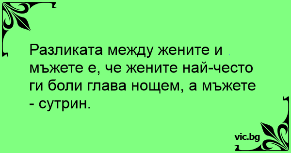 Разликата между жените и мъжете е, че жените най-често ги боли глава нощем, а мъжете - сутрин.