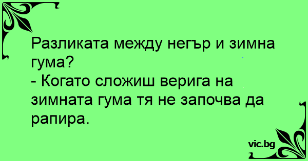 Víte jaký je rozdíl mezi pneumatikou a černochem? Když dáte řetězy na pneumatiku, tak nezačne rapovat.