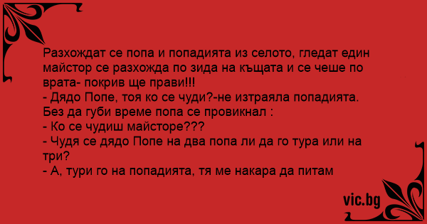 Разхождат се попа и попадията из селото, гледат един майстор се разхожда по зида на къщата и се чеше по врата- покрив ще прави!!!