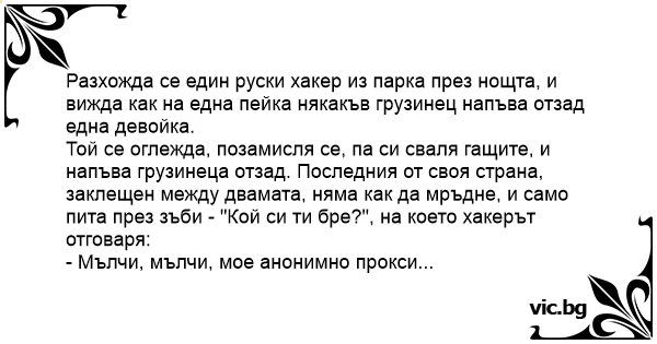 Разхожда се един руски хакер из парка през нощта, и вижда как на една пейка някакъв грузинец напъва отзад една девойка.