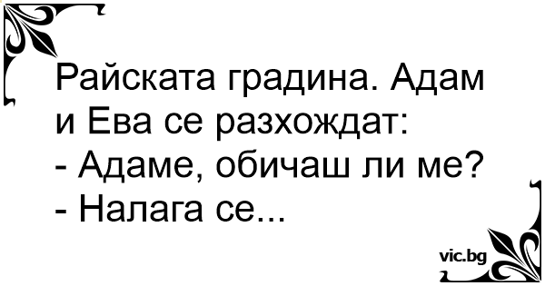 Љубов Ме сакаш ли? Ο Αδάμ Αδάμ και Εύα. адам и ева прогуливаются по эдемскому саду. ева спрашивает адама: -... Θεός- Αδάμ... Адам и Ева се разхождат из райската градина. Eva asks Adam in the Garden of Eden: Adam och Eva: - Adam, älskar du mig? - Javisst, vem annars? Eva fragt Adam im Paradies: "Adam, liebst du mich noch?" Adam: "Wen denn sonst?" Nun dia lindo Adão e Eva estão sentados no Jardim do Eden, quando Eva faz a seguinte pergunta a Adão: " Querido tu me amas?" E ele responde - E por acaso tem outra? Hørt når Adam spurte Eva om hun elsket han? - Ja, hvem ellers? Adam en Eva lopen door hun paradijs wanneer Eva ineens vraagt “Adam, hou jij nog steeds van mij?” waarop Adam antwoordt “Ja natuurlijk, van wie anders?” Rakastatko sinä minua Eeva, Aatami kysyi. No ketä muutakaan, Eeva ärähti. Eva en Adam liggen in de zon . Opeens vraagt Eva aan Adam: Zeg adam, houde gij eigenlijk nog van mij??? Natuurlijk zegt Adam met een teleurgesteld gezicht en hij zegt: Ja duuh stoem wijf, van wie... Adam: Eva, vil du gifte deg med meg? Eva: Ja. hvem ellers? Adão e Eva estavam no paraíso, quando Eva pergunta para Adão: — Bem, você me ama de verdade? Então Adão responde: — E eu tenho lá outra escolha! Adam wandelt voor de zondeval met God in de hof van Eden. Adam: "Waarom heeft u me eigenlijk zo'n mooie vrouw gegeven?" God: "Zodat jij van haar zou gaan houden." Adam: "Maar hoe komt het dan dat u... Idzie Adam i Ewa przez Raj. Ewa pyta Adama drżącym głosem: - Adamie kochasz Ty mnie? Adam odpowiada: - A kogo mam kochać? Adão e Eva passeiam pelo Paraíso: - Você me ama? - pergunta Eva. - E eu lá tenho escolha? Adam vraagt aan Eva: "Ben je op mij verliefd?" Zegt Eva: "Ja, op wie anders?" Eva: „Miluješ mě?” Adam: „A mám na výběr?” Adam si Eva se plimbau prin Rai: - Tu ma iubesti? - intreaba Eva. - Da, si mai departe ce facem? ... cu un ton Indiferent, raspunse Adam. Mannen säger till Gud: - Gud, varför har du gjort kvinnan så vacker? - För att du skulle kunna älska henne”, svarar Gud. - Varför gjorde du henne så dum? Så att hon skulle kunna älska dig.