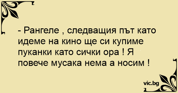 - Рангеле , следващия път като идеме на кино ще си купиме пуканки като сички ора ! Я повече мусака нема а носим !