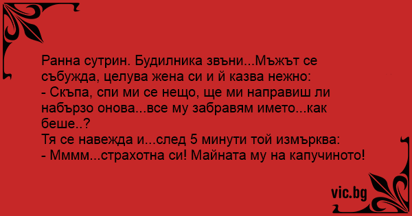 Ранна сутрин. Будилника звъни...Мъжът се събужда, целува жена си и й казва нежно: