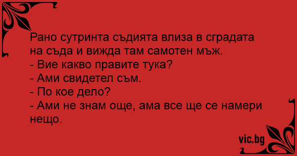 Рано сутринта съдията влиза в сградата на съда и вижда там самотен мъж.