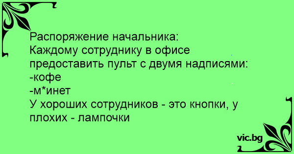 Постанова директора: Кожному співробітнику в офісі надати пульт з двома надписами: - кава - мінет У хороших співробітників - це кнопки, у поганих - лампочки.