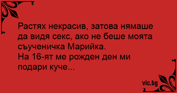 Растях некрасив, затова нямаше да видя cekc, ако не беше моята съученичка Марийка.