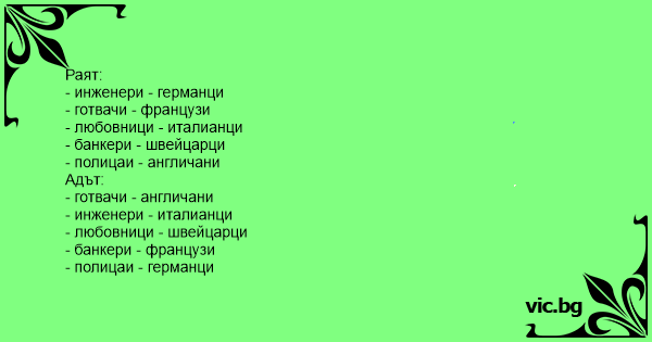 Raiul e locul unde politistii sunt englezi, bucatarii sunt italieni, mecanicii germani, iubitii francezi si organizatorii sunt elvetieni. Iadul este locul unde politistii sunt nemti, bucatarii...