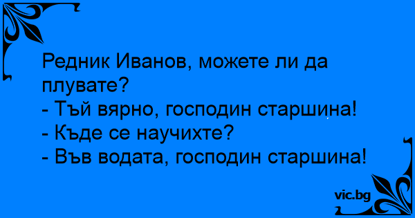 Прапорщик — солдату: - Товаришу солдат, ви вмієте плавати? - Так точно! - Де ви цьому навчились? - У воді, товаришу прапорщик!