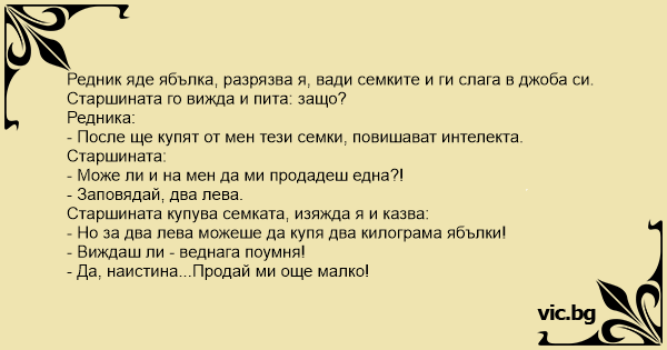 Блондинка-феминистка, известна с острите си речи по телевизията срещу мъжете, се разхождала из пазара. На една сергия видяла, че покрай другото продават и семки от ябълки.