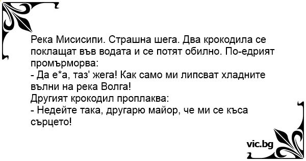Река Мисисипи. Страшна шега. Два крокодила се поклащат във водата и се потят обилно. По-едрият промърморва:
