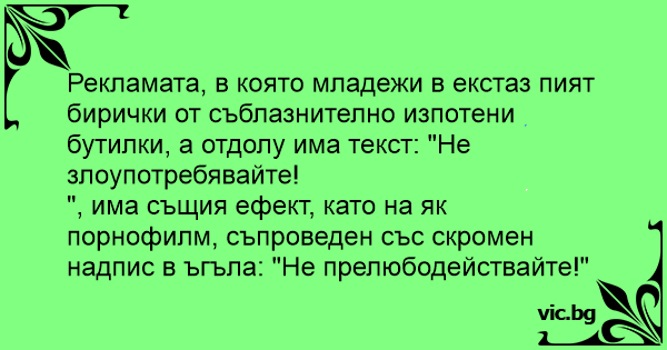 Рекламата, в която младежи в екстаз пият бирички от съблазнително изпотени бутилки, а отдолу има текст: "Не злоупотребявайте!