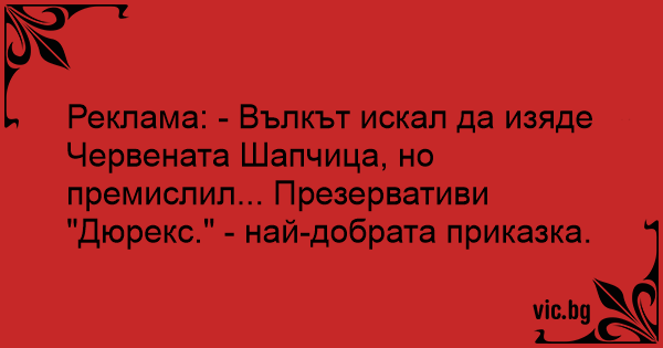 Реклама: - Вълкът искал да изяде Червената Шапчица, но премислил... Презервативи "Дюрекс." - най-добрата приказка.