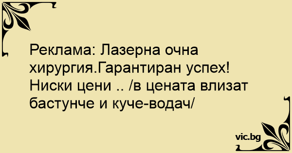 Реклама: Лазерна очна хирургия.Гарантиран успех! Ниски цени .. /в цената влизат бастунче и куче-водач/