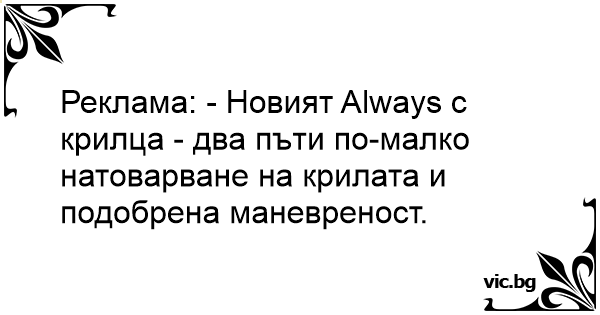 Реклама: - Новият Always с крилца - два пъти по-малко натоварване на крилата и подобрена маневреност.