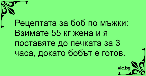 Взимате 55 кг жена и я поставяте до печката за 3 часа, докато бобът е готов.